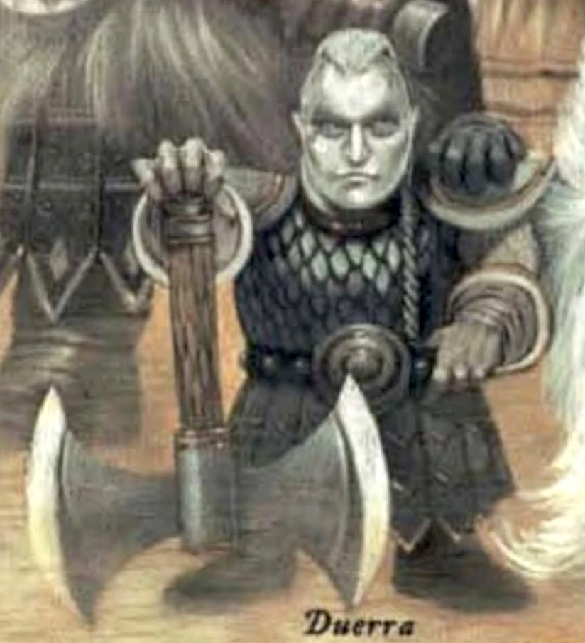 Принцесса Топора тайно чувствует себя ограниченной своим покровителем, относясь к её "отцу" как к человеку, чья горечь и злоба уничтожили столетия возможностей заявить о своих правах на рождение дуэргаров, и там, где Ладугуэр фиксируется на чувствах отвержения и недооценки, Дуэрра равнодушна к дальней родословной дуэргаров. Дуэрра бесконечно строит планы против Ладугуэра, и он делает то же самое, и в недавнее время Дуэрра, говорят, что Дуэрра всего в шаге от попытки свергнуть его с поста главного божества серых дварфов.