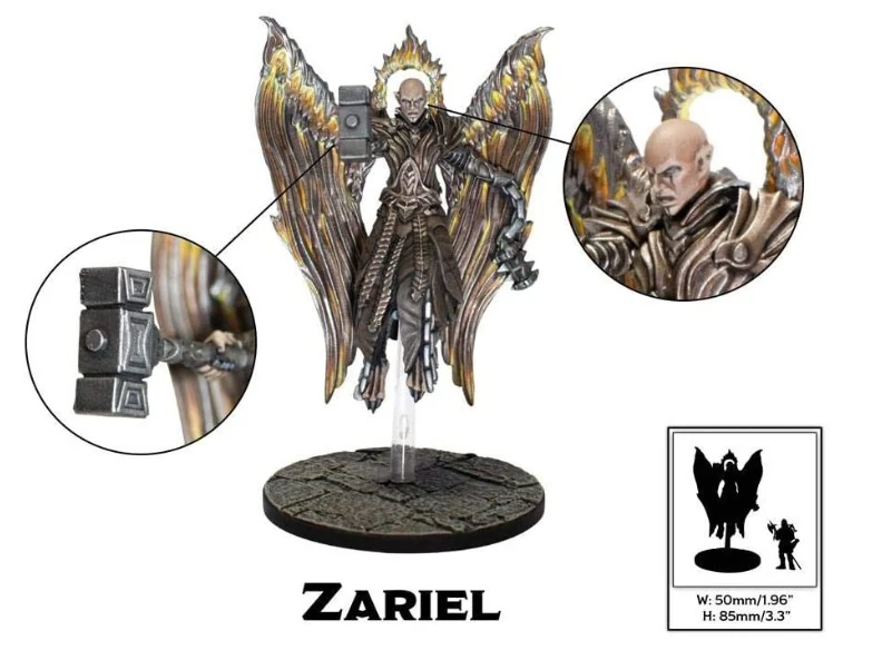 Миниатюра Зариель времён Пятой редакции (вариант Baldur’s Gate: Descent Into Avernus - с дробящим оружием и нимбом вместо рогов). Справа внизу для масштаба дан человек.