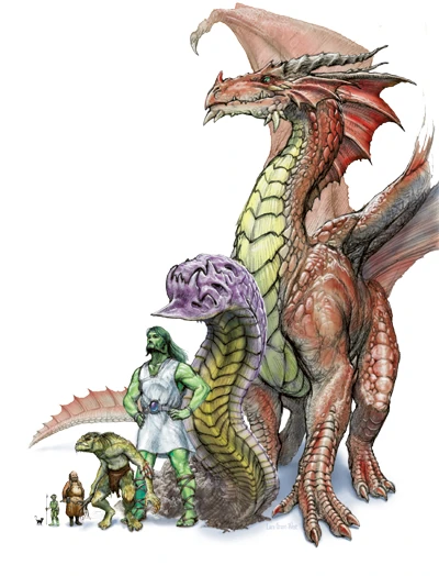 Категории размеров в 3.5-й редакции Dungeons & Dragons: слева направо кошка (размер Tiny), гоблин (Small), человек (Medium), огр (Large), штормовой великан (Huge), пурпурный червь (Gargantuan), древний красный дракон (Colossal).