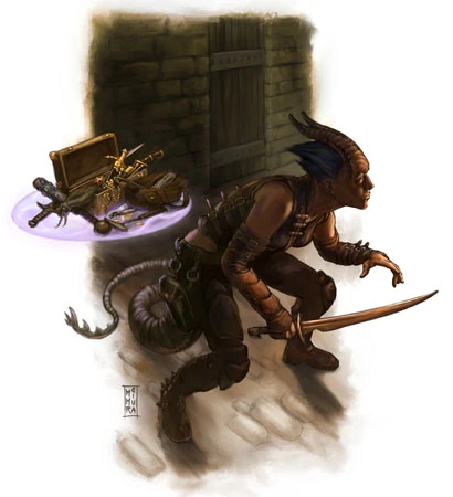 Тифлинг, сопровождаемый парящим диском Тензера. Иллюстрация из PHB D&D 4