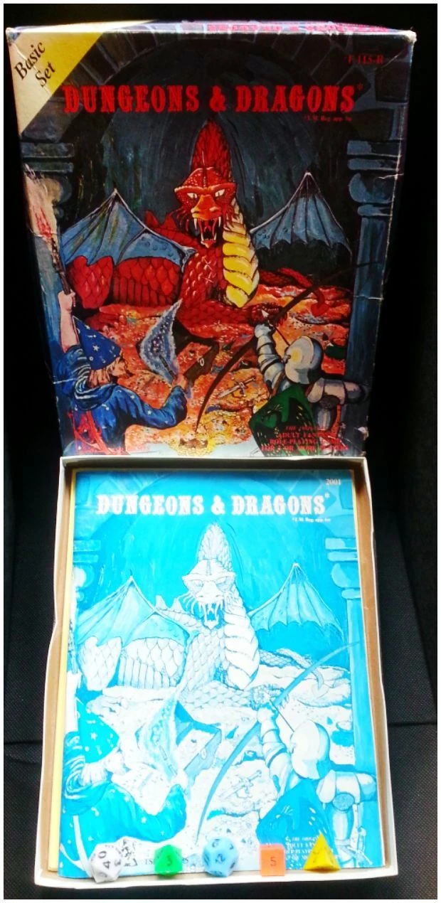 В коробочный комплект входили пять дайсов: d4, d6, d8, d12 и d20[7], причём последний был маркирован дважды от нуля до девятки, и использовался как d10. Для броска собственно d20 нужно было его бросать вместе с «контрольным» кубиком d6 и добавлять 10, если на нём выпало 4-6. Знакомый современным игрокам d10 (пятиугольный трапецоэдр) появился только к 1980 году[8].
