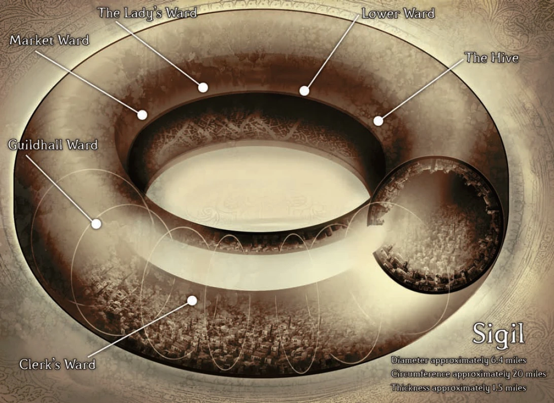 Sigil is a city-plane, constructed on the inside surface of a toral plane so completely that there are almost no edges to the city, save where the sky adheres. It is said that one can go from Sigil to anywhere, as portals exist throughout the city to every part of every plane. Thus it holds the nickname, The City of Doors.